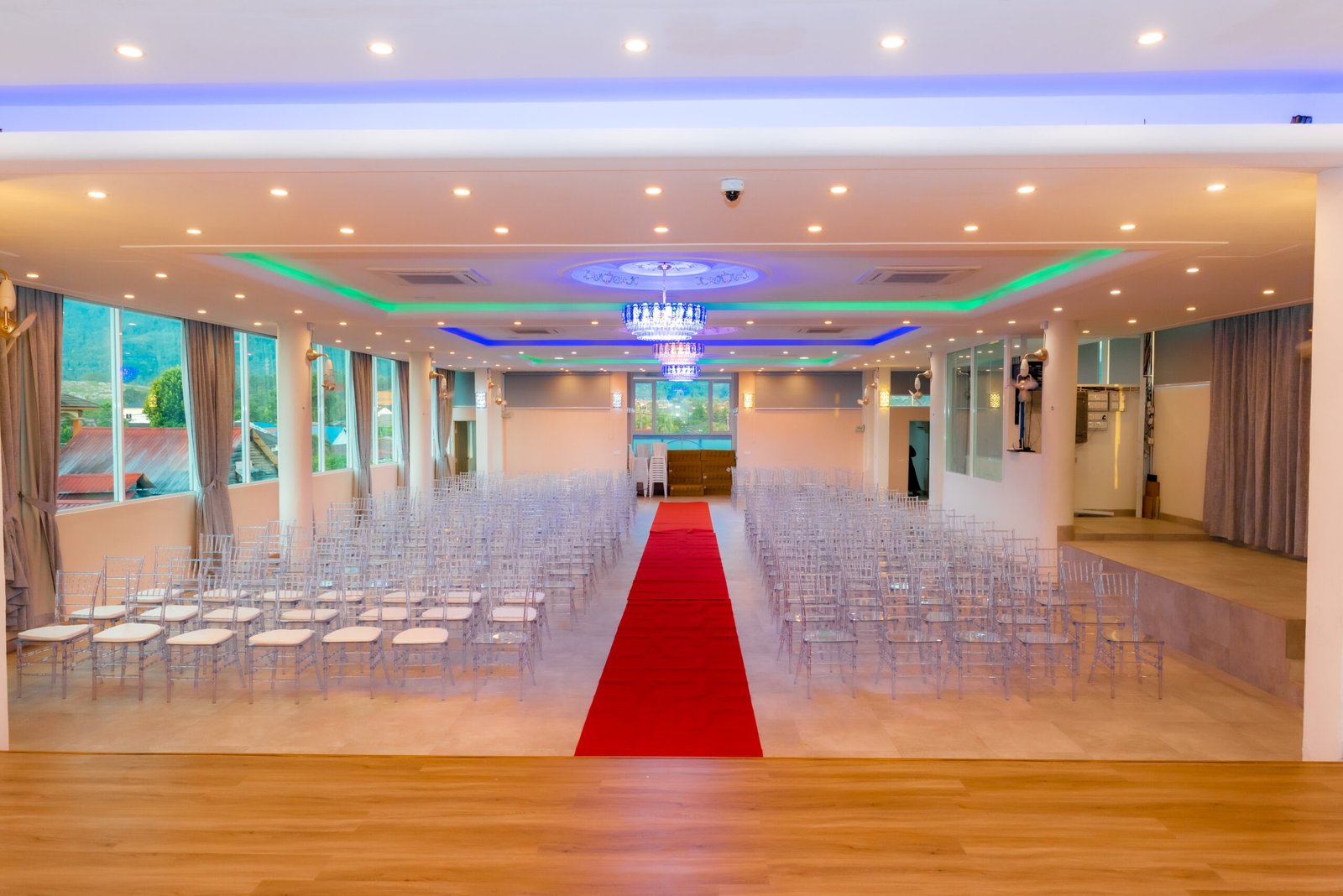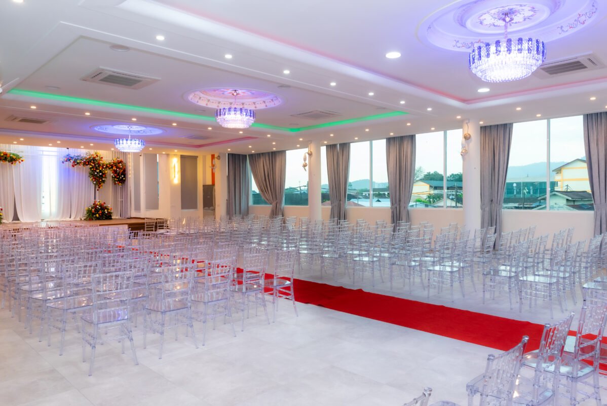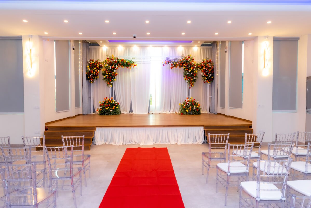 Raintree Hall is a venue that perfectly balances contemporary design with timeless elegance. The spacious interior, highlighted by high ceilings, grand chandeliers, and luxurious finishes, creates an atmosphere of sophistication and class. Every detail—from the elegant flooring to the soft, flowing drapery—complements the natural beauty of its surroundings. Whether you’re hosting a lavish wedding or a formal corporate event, the hall offers a space where elegance is always at the forefront.